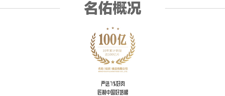 名佑(福建)食品有限公司從原料采購到生產(chǎn)加工過程,建立全程質(zhì)量追溯體系,主營培根系列產(chǎn)品經(jīng)過21道嚴(yán)苛生產(chǎn)工序(分割-配料-滾揉-裝模-煙熏-脫模-切片-裝袋-真空-裝箱等21道工序),生產(chǎn)出高質(zhì)量產(chǎn)品。公司先后獲得“農(nóng)業(yè)產(chǎn)業(yè)化國家級(jí)重點(diǎn)龍頭企業(yè)”、“省級(jí)重點(diǎn)龍頭企業(yè)”、“福建省科技小巨人領(lǐng)軍企業(yè)”、“福建省科技型企業(yè)”、“福建省西式肉制品生產(chǎn)標(biāo)桿企業(yè)”等榮譽(yù)稱號(hào)。名佑參與培根、火腿國家標(biāo)準(zhǔn)制定,核心產(chǎn)品“經(jīng)典培根”,被評(píng)為“福建省名牌產(chǎn)品”,榮獲《ITQI國際頂級(jí)美味獎(jiǎng)?wù)隆罚瑧{借著專業(yè)和美味受到了國內(nèi)外餐飲行業(yè)的一致好評(píng)。