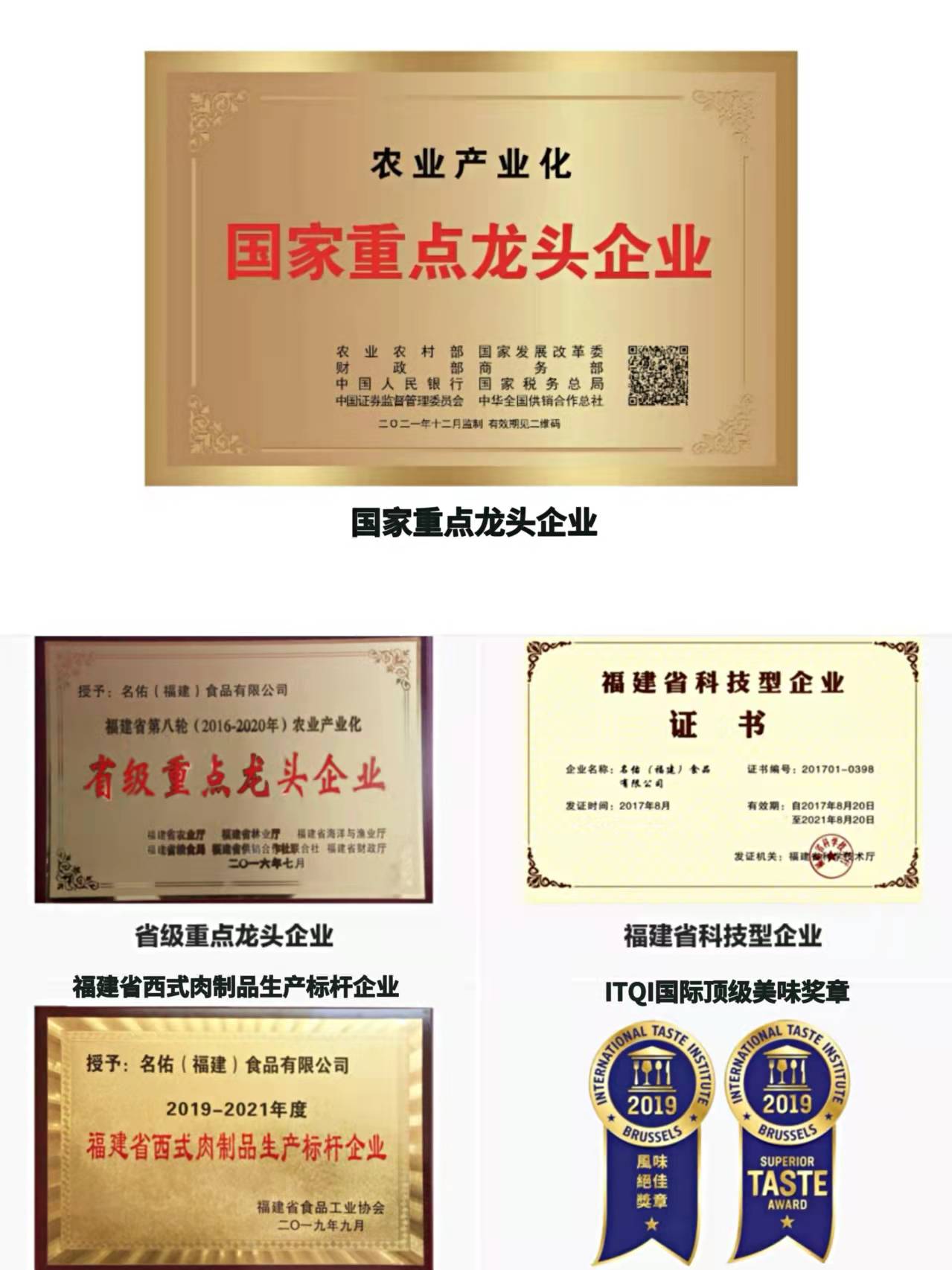 公司沿著“品牌化運(yùn)作,職業(yè)化經(jīng)營”戰(zhàn)略思想,在全體員工的共同努力下,“名佑”牌培根市場占有率不斷攀升,成為全國較大低溫西式肉制品培根制造商,不斷得到社會(huì)認(rèn)可和政府支持。公司被授予“農(nóng)業(yè)產(chǎn)業(yè)化國家級(jí)重點(diǎn)龍頭企業(yè)”、“全國模范職工之家”、“福建省民營企業(yè)黨建工作先進(jìn)單位”“福建省守合同重信用企業(yè)”、“福建省科技小巨人領(lǐng)軍企業(yè)”、“福建省西式肉制品生產(chǎn)標(biāo)桿企業(yè)”、“三明市十佳誠信用工企業(yè)”、“三元區(qū)納稅大戶”;公司“名佑”商標(biāo)被評(píng)為“福建省著名商標(biāo)”;公司經(jīng)典培根被評(píng)為“福建省名牌產(chǎn)品”,榮獲《ITQI國際頂級(jí)美味獎(jiǎng)?wù)隆罚瑧{借著專業(yè)和美味受到了國內(nèi)外餐飲行業(yè)的一致好評(píng)。